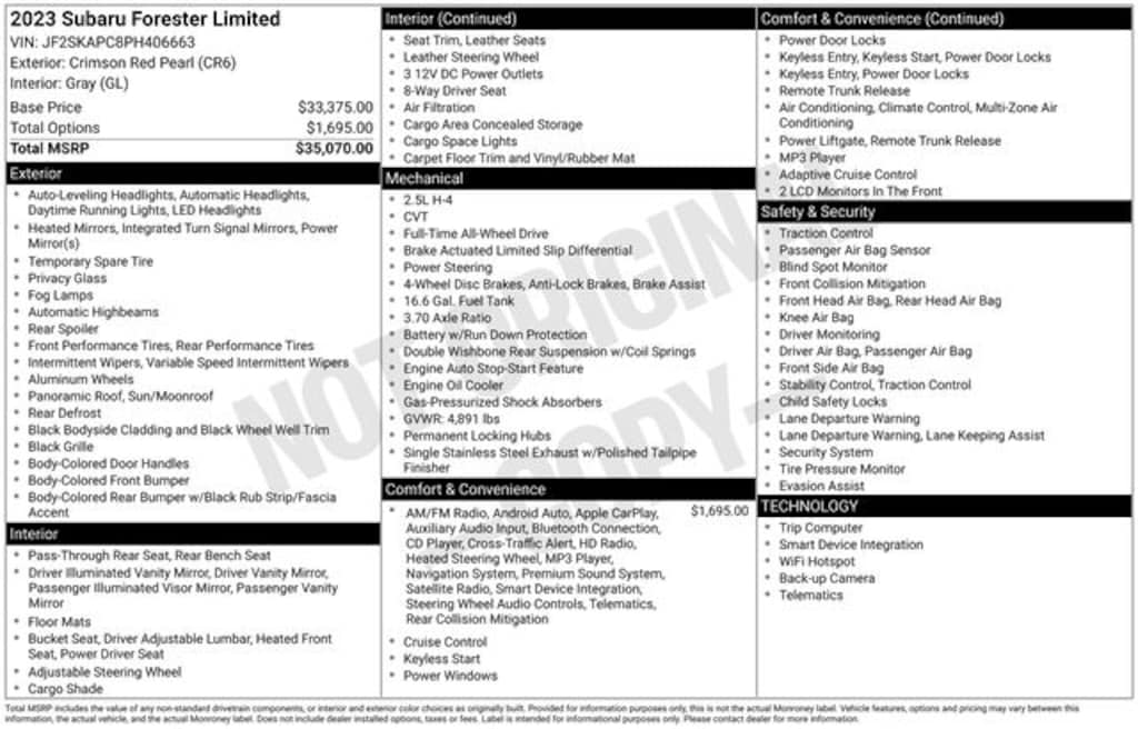 Elevate your driving experience and make this 2023 Subaru Forester Limited your own. With its exceptional features, impressive performance, and the added benefits of Subaru's Certified Pre-Owned program, this SUV is the perfect choice for discerning drivers like you. Visit our showroom today and let us demonstrate why this Forester is the ideal vehicle to fulfill all your automotive needs.