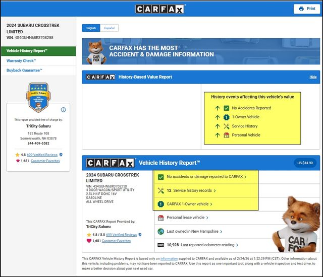 As a Subaru Certified Pre-Owned vehicle, this Crosstrek Limited has undergone a rigorous 152-point inspection and comes with a comprehensive warranty, roadside assistance, and a transferable vehicle history. Additionally, you'll enjoy a 3-month SiriusXM trial subscription, a $500 Owner Loyalty coupon, and a 1-year trial subscription to STARLINK.
