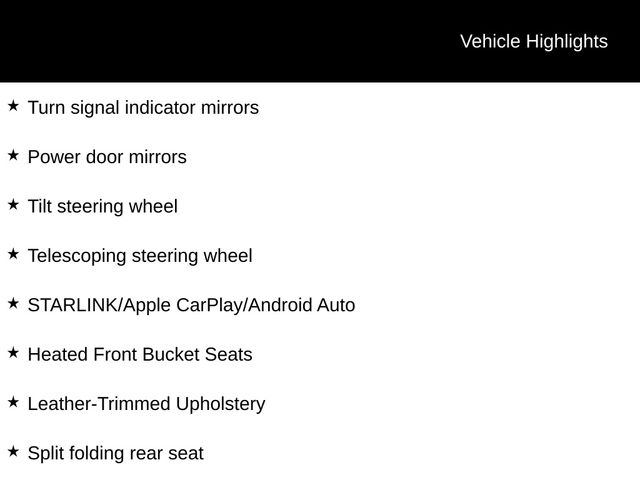 - Front dual zone A/C, Remote keyless entry, Steering wheel mounted audio controls, Emergency communication system: STARLINK Safety and Security, Power Moonroof, Exterior Parking Camera Rear, Front fog lights, Speed control, Heated door mirrors, Power door mirrors, Turn signal indicator mirrors, STARLINK/Apple CarPlay/Android Auto, Telescoping steering wheel, Tilt steering wheel, Heated Front Bucket Seats, Leather-Trimmed Upholstery, Split folding rear seat, Wheels: 18" x 7.0J Dark Gray Aluminum Alloy