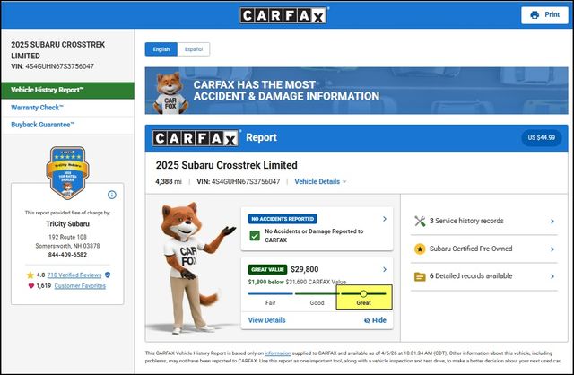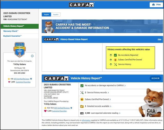 As a Subaru Certified Pre-Owned vehicle, this Crosstrek Limited has undergone a rigorous 152-point inspection and comes with a Powertrain Limited Warranty of 84 months/100,000 miles, roadside assistance, and a transferable warranty. Additionally, you'll enjoy a 3-month SiriusXM trial subscription, a $500 Owner Loyalty coupon, and a 1-year trial subscription to STARLINK.