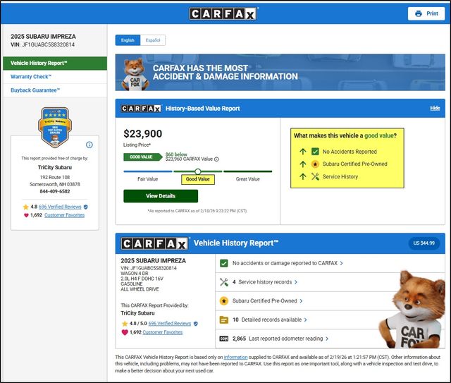 As a Subaru Certified Pre-Owned vehicle, this Impreza has undergone a rigorous 152-point inspection and comes with a comprehensive warranty and roadside assistance program. The Powertrain Limited Warranty extends coverage for up to 84 months or 100,000 miles, providing you with added peace of mind.