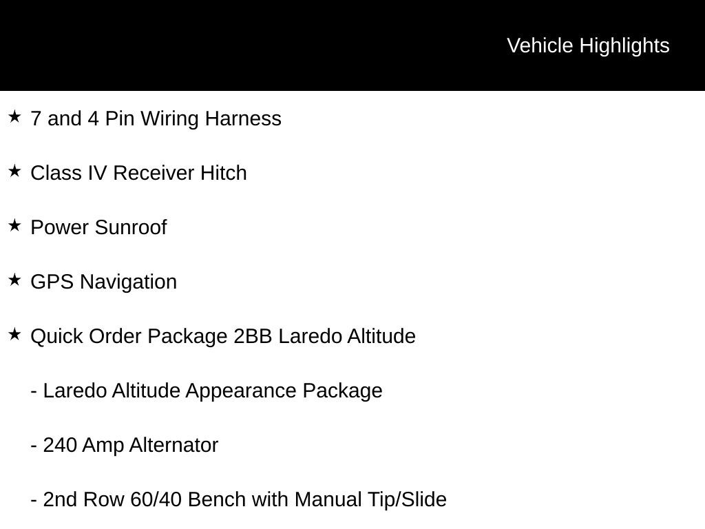 Diamond Black Crystal Pearlcoat 2026 Jeep Grand Cherokee L Laredo 8-Speed Automatic 115V Auxiliary Power Outlet, 12.3" Touchscreen Display, 240 Amp Alternator, 2nd Row 60/40 Bench with Manual Tip/Slide, 2nd Row Seat Center Armrest/Cupholders, 3 Rear Seat Head Restraints, 3.70 Rear Axle Ratio, 3rd Row Charge-Only USB Ports, 4G LTE Wi-Fi Hot Spot, 7 and 4 Pin Wiring Harness, 7-Passenger Seating, Active Driving Assist System, Active Noise Control System, an-Teak/Satin Chrome Interior Accents, Apple CarPlay, Automatic temperature control, Black Headliner, Body Color Door Handles (B), Capri Leatherette/Suede Seats, Center Rear 3-Point Seat Belt, Class IV Receiver Hitch, Connected Travel and Traffic Services, Connectivity - US/Canada, Delete Laredo Badge, Disassociated Touchscreen Display, Dual Exhaust Tips, Exterior Accents Dark Neutral Metallic, For Details, Visit DriveUconnect.com, Four wheel independent suspension, Front Fascia Upper A, Global Telematics Box Module (TBM), Google Android Auto, GPS Antenna Input, GPS Navigation, HD Radio, Heated Front Seats, Heated Steering Wheel, Heavy-Duty Engine Cooling, Integrated Center Stack Radio, Integrated Voice Command with Bluetooth, Intersection Collision Assist System, Laredo Altitude Appearance Package, Manual Fold Seatbacks, Power Liftgate, Power Sunroof, Quick Order Package 2BB Laredo Altitude, Radio: Uconnect 5 Nav with 12.3" Display, Rain Sensitive Windshield Wipers, Rear Fascia Upper A, Rear Load Leveling Suspension, Remote Start System, Secondary Active Grille Shutters, Selec-Terrain System, Selectable Tire Fill Alert, SiriusXM with 360L, Traffic Sign Recognition, Trailer Hitch Zoom, Trailer Tow Package, USB Host Flip, Wheels: 18" x 8.0" Fully Painted Aluminum 1, Wireless Charging Pad. Price includes: $1500 - 2026 National Retail Bonus Cash . Exp. 04/30/2026