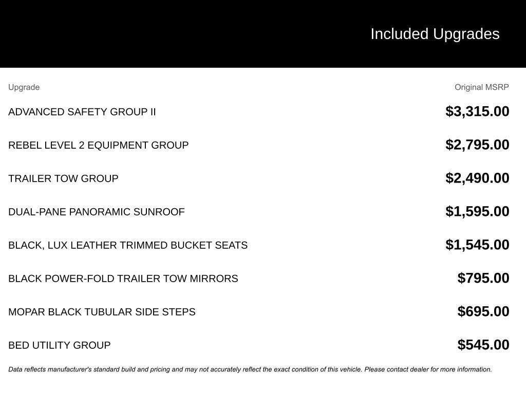 Canyon Lake 2026 Ram 1500 Rebel 8-Speed Automatic 115V Auxiliary Rear Power Outlet, 12-Way/1-Way Trailer Connector, 14.4" Touchscreen Display, 2-Door Passive Entry, Front Door Locks, 4G LTE Wi-Fi Hot Spot, Accent Color Door Handles, Accent Color Premium Power Mirrors, Accent Color Tailgate Handle, Active Driving Assist System, Advanced Safety Group II, Apple CarPlay, Auto Power-Folding Mirrors, Auto-Dimming Exterior Driver Mirror, Bed Utility Group, Black Painted Exterior Mirrors Caps, Connected Travel & Traffic Services, Connectivity - US/Canada, Convex Wide-Angle Exterior Mirror Insert, Disassociated Touchscreen Display, Dome Dual LED Reading Lamp, Driver Seat Memory, Drowsy Driver Detection, Dual Wireless Charging Pad, Dual-Pane Panoramic Sunroof, Electronic Stability Control, Evasive Steer Assist, Exterior 115V AC Outlet, Exterior Mirrors Approach Lamps, Exterior Mirrors Courtesy Lamps, Exterior Mirrors w/Heating Element, Exterior Mirrors w/Memory, Exterior Mirrors w/Supplemental Signals, Front fog lights, Front Passenger Interactive Display, Global Telematics Box Module (TBM), Google Android Auto, GPS Antenna Input, GPS Navigation, harman/kardon 19 Speaker Premium Sound, HD Radio, Heated Second Row Seats, Integrated Center Stack Radio, Integrated Voice Command w/Bluetooth, Intersection Collision Assist System, Media Hub w/2 Charge Only USBs, MOPAR 4 Adjustable Cargo Tie-Down Hooks, Mopar Black Tubular Side Steps, Off-Road Information Pages, Panic alarm, ParkView Rear Back-Up Camera, Power 2-Way Passenger Lumbar Adjust, Power Adjust 8-Way Front Passenger Seat, Power Adjustable Pedals w/Memory, Power Tailgate, Proximity Approach/Departure Lamps, Radio: Uconnect 5 Nav w/14.4" Display, Radio/Driver Seat/Mirrors/Pedals Memory, Rain Sensitive Windshield Wipers, Rear Window Defroster, Rebel Level 2 Equipment Group, Security Alarm, SiriusXM Radio Service, SiriusXM w/360L, Smartphone As A Key Capable, Surround View Camera System, Traffic Sign Recognition, USB Host Flip. Price includes: $3500 - 2026 National Retail Bonus Cash . Exp. 04/30/2026