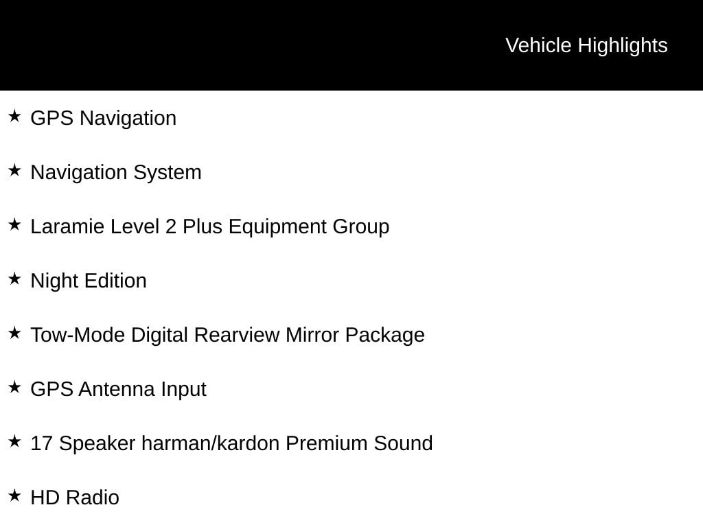 Pdn 2026 Ram 2500 Laramie 8-Speed Automatic #1 Seat Foam Cushion, 115V Auxiliary Rear Power Outlet, 14.4" Touchscreen Display, 17 Speaker harman/kardon Premium Sound, 2 Way Rear Headrest Seat, 2nd Row In Floor Storage Bins, 4 Way Front Headrests, 4G LTE Wi-Fi Hot Spot, Active Lane Management System, Adaptive Steering System, Alexa Built-In, Anti-Spin Differential Rear Axle, Apple CarPlay, Auto Adjust In Reverse Exterior Mirrors, Auto Dim Exterior Mirror, Auto High Beam Headlamp Control, Auto Power-Folding Mirrors, Auto-Dimming Exterior Passenger Mirror, Black Exterior Mirrors, Black Exterior Truck Badging, Black Wheel Center Hub, Body Color Grille-Surround, Bucket Seats, Chrome Exterior Mirrors, Connected Travel & Traffic Services, Connectivity - US/Canada, CTR Stop Lamp w/Cargo View Camera, Digital Rearview Mirror, Disassociated Touchscreen Display, Drowsy Driver Detection, Dual Wireless Charging Pad, Electronic Stability Control, Emergency Vehicle Alert System (EVAS), Exterior Mirrors Courtesy Lamps, Exterior Mirrors w/Heating Element, Exterior Mirrors w/Memory, Exterior Mirrors w/Supplemental Signals, Foam Bottle Insert (Door Trim Panel), Folding Flat Load Floor Storage, For Details, Visit DriveUconnect.com, For More Info, Call 800-643-2112, Forward & Reverse Utility Lights, Front fog lights, Front Seat Back Map Pockets, Full Length Upgraded Floor Console, Global Telematics Box Module (TBM), Gloss Black Grille Billets/Accents, Google Android Auto, GPS Antenna Input, GPS Navigation, HD Radio, Heated Front Seats, Heated Steering Wheel, High Back Seats, Integrated Voice Command w/Bluetooth, Laramie Level 2 Plus Equipment Group, Leather Trimmed Bucket Seats, LED Bed Lighting, Mirror Running Lights, MOPAR Deployable Bed Step, MOPAR Spray In Bedliner, Navigation System, Night Edition, Off-Road Info Pages, ParkView Rear Back-Up Camera, Power 2-Way Driver Lumbar Adjust, Power 2-Way Passenger Lumbar Adjust, Power Adjust 8-Way Driver Seat, Power Adjust 8-Way Front Passenger Seat, Power Adjust Mirrors, Power Adjustable Pedals w/Memory, Power Deployable Running Boards, Power Heated Fold Telescopic Mirrors w/Memory, Power Sunroof, Power Telescoping Mirrors, Power-Adjustable Convex Aux Mirrors, Radio: Uconnect 5 Nav w/14.4" Display, Radio/Driver Seat/Mirrors/Pedals Memory, Rain Sensitive Windshield Wipers, Rear 60/40 Folding Seat, Remote Tailgate Release, Selectable Tire Fill Alert, SiriusXM Radio Service, SiriusXM w/360L, Sport Performance Hood, Tow-Mode Camera (Wired), Tow-Mode Digital Rearview Mirror Package, Traffic Sign Recognition, Trailer Tow Pages, Ventilated Front Seats, Wheels: 20" x 8.0" Black Painted Aluminum. Price includes: $1000 - 2026 National Bonus Cash . Exp. 11/03/2025