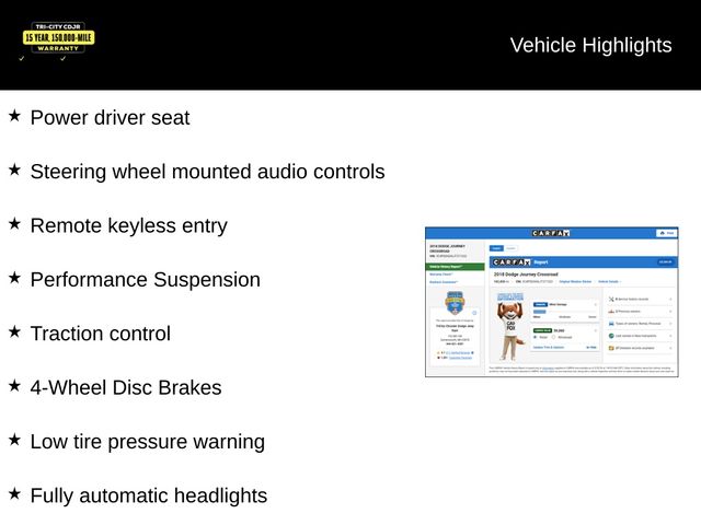 Tackle any terrain with confidence, thanks to the Journey's all-wheel drive capability and performance-tuned suspension. The 19-inch black noise aluminum wheels and speed-sensitive wipers add a touch of sophistication to the exterior, while the front fog lights and fully automatic headlights ensure excellent visibility in any driving conditions.