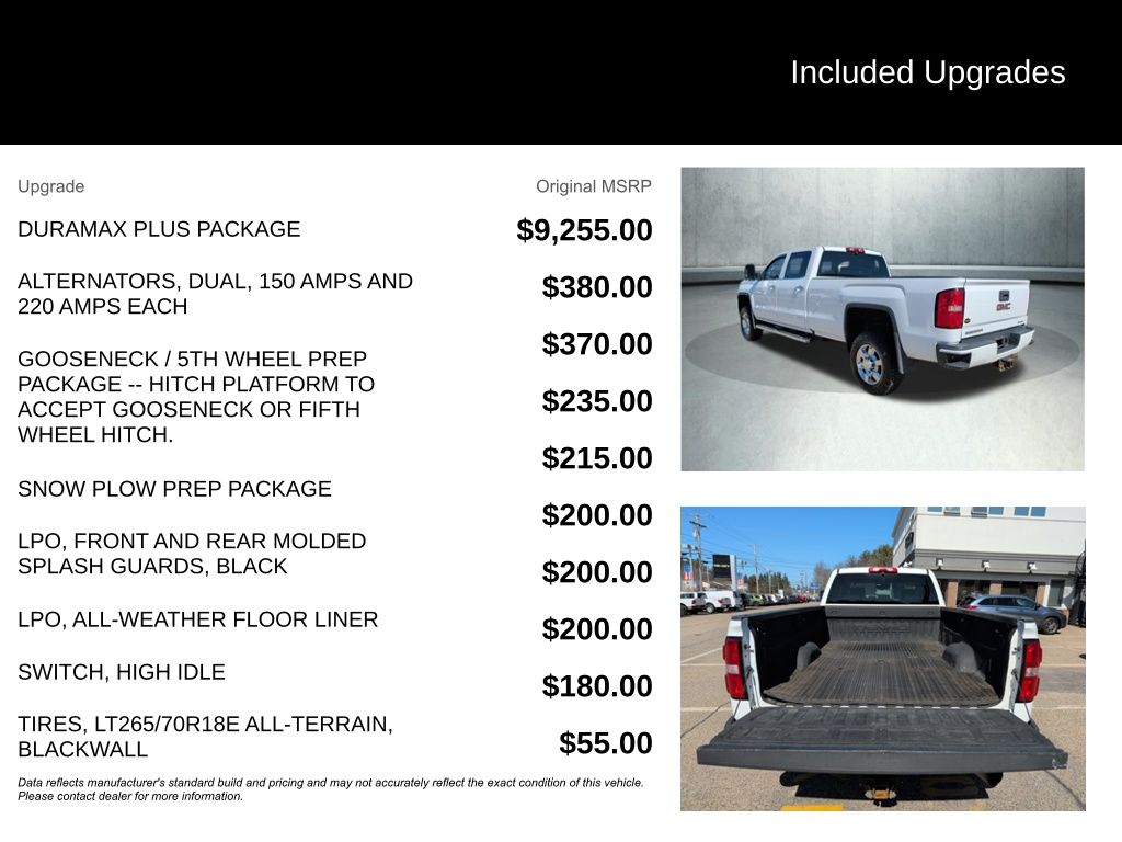 2017 GMC Sierra 3500HD Denali Allison 1000 6-Speed Automatic, 4WD, Jet Black Leather, 110-Volt AC Power Outlet, 8" Multi-Color Customizable Driver Display, Apple CarPlay/Android Auto, Auto High-beam Headlights, Auto-Dimming Inside Rear-View Mirror, Bose Speaker System, Driver & Front Passenger Visors, Driver Alert Package, Dual 150 Amps & 220 Amps Each Alternator, Engine Block Heater, Exhaust Brake, Exterior Parking Camera Rear, Forward Collision Alert, Front Halogen Fog Lamps, Fully automatic headlights, Gooseneck/5th Wheel Prep Package, Heated & Ventilated Front Seating, Heated door mirrors, Heated steering wheel, Heavy Duty Front Springs, High-Intensity Discharge Headlights, Lane Departure Warning System, Memory seat, Navigation System, Pedal memory, Perforated Leather-Appointed Seat Trim, Power Adjustable Pedals, Power door mirrors, Power driver seat, Power passenger seat, Power Sliding Rear Window w/Defogger, Preferred Equipment Group 5SA, Rear Vision Camera, Remote Vehicle Starter System, Snow Plow Prep Package, Speed control, Trailering Equipment, Turn signal indicator mirrors, Ultrasonic Front & Rear Park Assist.
