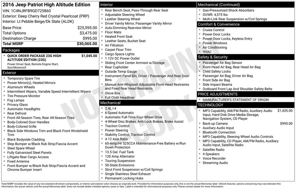 This 2016 Jeep Patriot High Altitude is a true standout in its class, blending rugged capability, premium amenities, and a sophisticated design. Experience the difference for yourself and schedule a test drive today. We're confident this Patriot will exceed your expectations and become the perfect addition to your lifestyle.