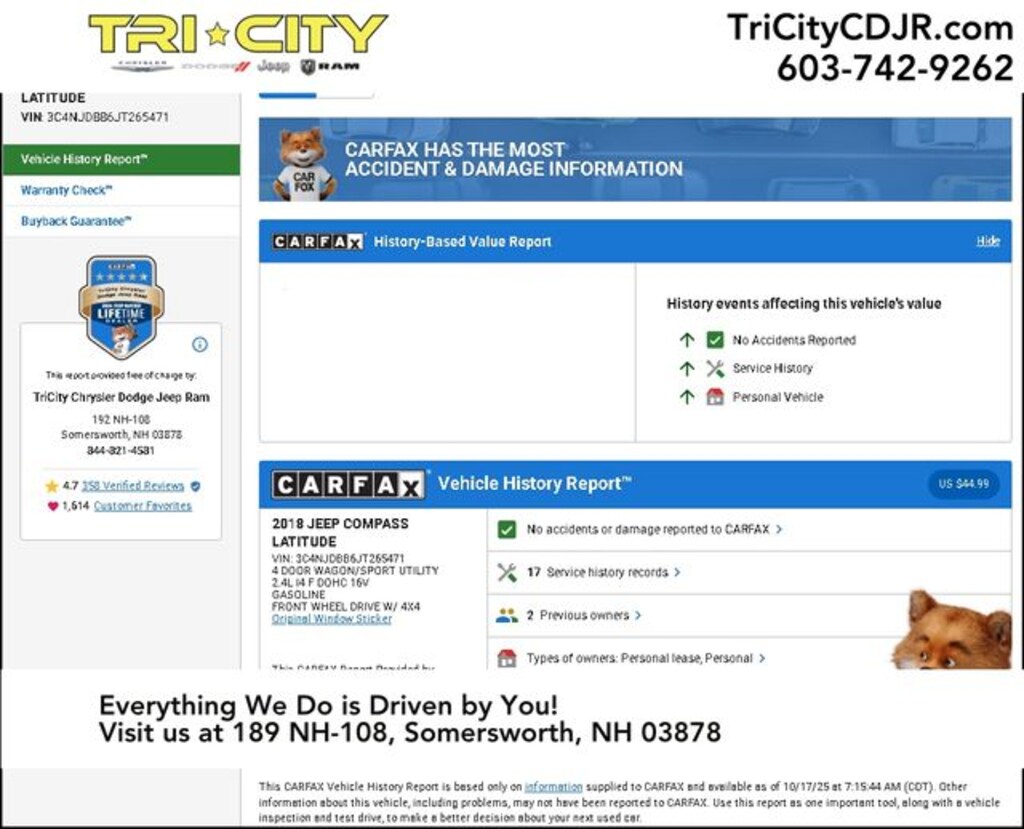 With its exceptional features, impressive performance, and striking good looks, this 2018 Jeep Compass Latitude is the perfect companion for your next adventure. Don't miss your chance to make this SUV your own. Contact us today to schedule a test drive and experience the difference for yourself.