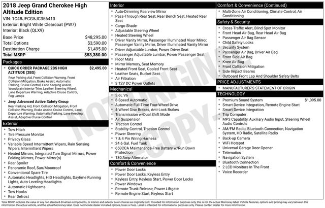 2018 Jeep Grand Cherokee High Altitude Bright White Clearcoat 4WD, 7 & 4 Pin Wiring Harness, Adaptive Cruise Control w/Stop, Advanced Brake Assist, AM/FM radio: SiriusXM, Anodized/Light Black Chrome Interior Accents, Black Roof Molding, Black Wood Instrument Panel & Door Spears, Blind Spot & Cross Path Detection, Body Color Door Handles, Body Color Exterior Mirrors, Body Color Fascias w/Granite Accents, Body Color Sill Extension, Bright Pedals, Class IV Receiver Hitch, Dark Day Light Opening Moldings, Dark Headlamp Bezel Finish, Dark Lens Taillamps, Dual Dark Chrome Exhaust Tip, Full Speed FWD Collision Warn Plus, Granite Crystal Exterior Accents, Granite Crystal Exterior Badging, Granite Crystal/Black Grille, Headlamp Washer, Heated front seats, Heated rear seats, Heated steering wheel, High Altitude II Package, Jeep Advanced Active Safety Group, Lane Departure Warning Plus, Leather Trim Seats w/Edge Welting, Leather Wrapped Steering Wheel, Low tire pressure warning, Nappa Leather Trimmed Bucket Seats (DISC), Parallel & Perp Park Assist w/Stop, Power moonroof, Power passenger seat, Premium Accent Claddings, Premium LED Fog Lamps, Quick Order Package 2BS High Altitude (DISC), Radio: Uconnect 4C Nav w/8.4" Display, Rain Sensitive Windshield Wipers, Rear Load Leveling Suspension, Trailer Tow Group IV (DISC), Ventilated front seats, Wheels: 20" x 8.0" Granite Crystal Aluminum (DISC).