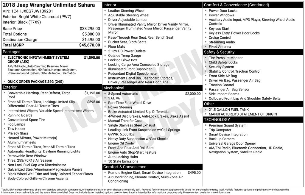 Discover the perfect blend of adventure and sophistication with this 2018 Jeep Wrangler Unlimited Sahara. Boasting a sleek white exterior and a powerful 3.6L V6 24V VVT engine paired with an 8-Speed Automatic transmission, this Wrangler is ready to conquer any terrain while delivering impressive fuel efficiency of 18 city/23 highway MPG.