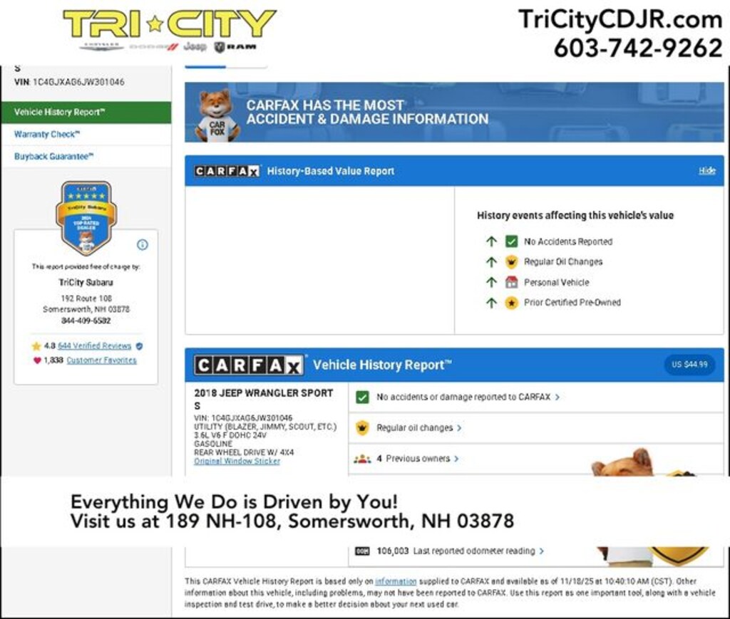 With 106,003 miles, this well-maintained Wrangler is ready to take you and your family on unforgettable adventures. The combination of rugged capability, advanced technology, and premium features make this an exceptional value in the Wrangler lineup.