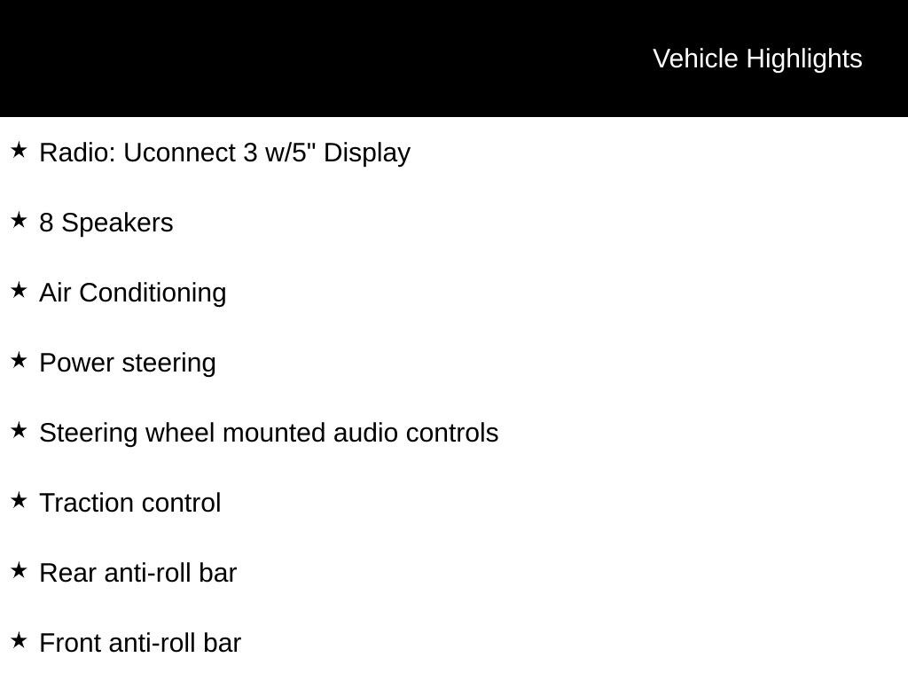 - Wireless phone connectivity: Uconnect w/Bluetooth