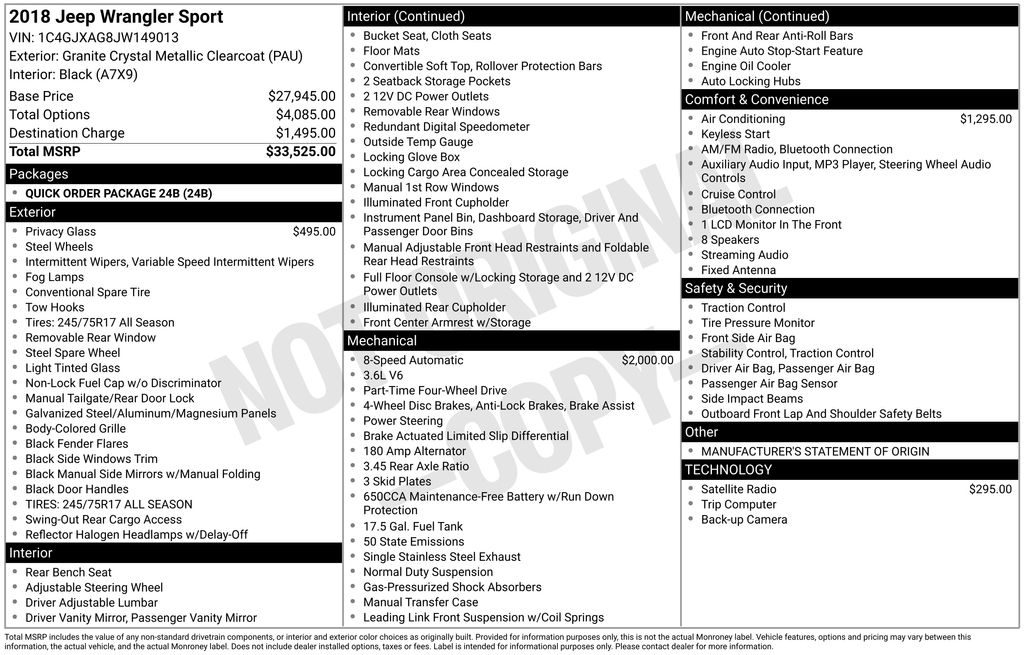 2018 Jeep Wrangler Sport 8 Speakers, Air Conditioning, Deep Tint Sunscreen Windows, Electronic Stability Control, Front anti-roll bar, Front Bucket Seats, Front fog lights, ParkView Rear Back-Up Camera, Power steering, Radio: Uconnect 3 w/5" Display, Rear anti-roll bar, Steering wheel mounted audio controls, Traction control, Wheels: 17" x 7.5" Black Steel Styled. Clean CARFAX.