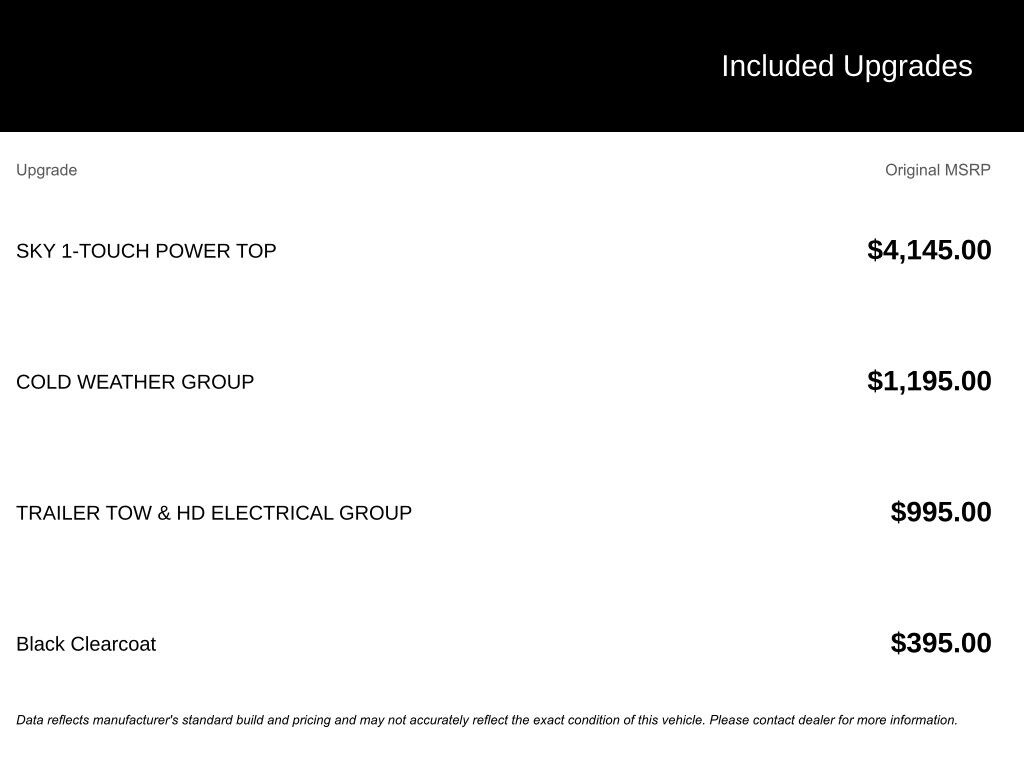 - Sky 1-Touch Power Top: Enjoy open-air freedom with the push of a button, plus removable rear quarter windows and a power top storage bag. $4145.00 Added Value!
