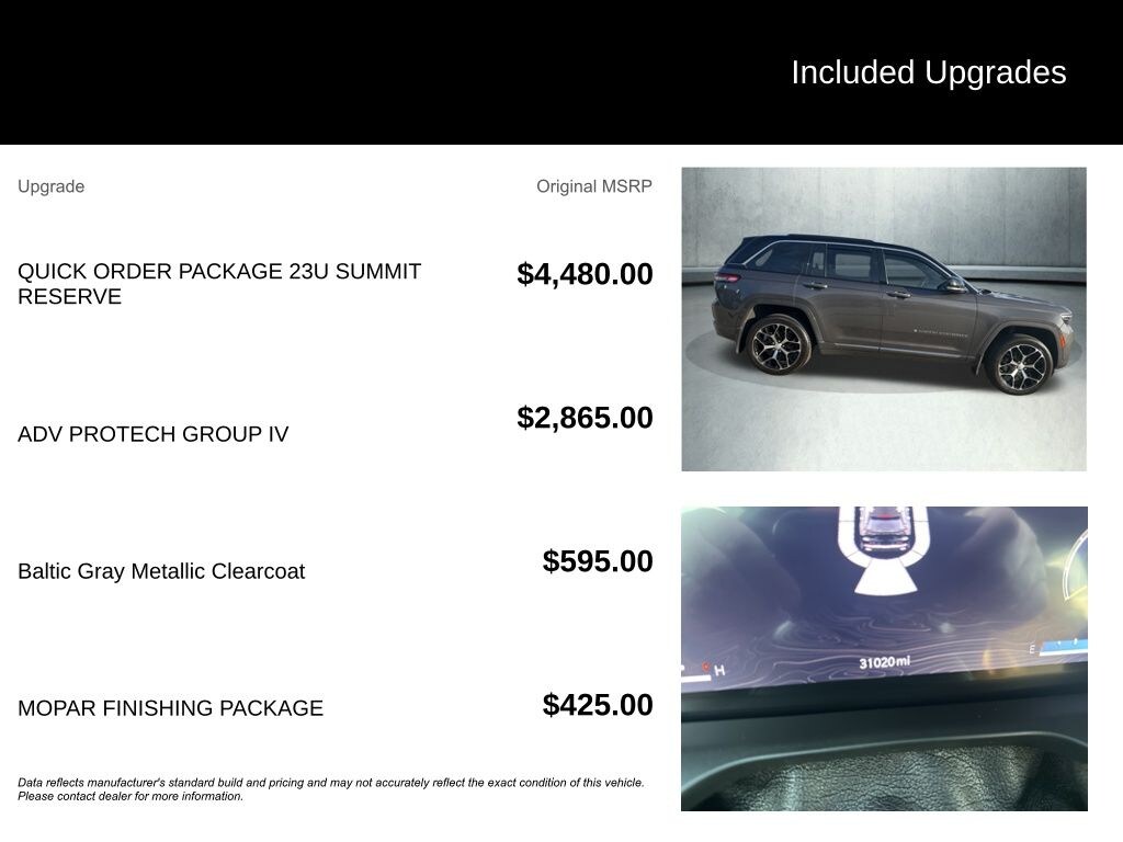 2023 Jeep Grand Cherokee Summit 4WD, 19 Speakers High Performance Audio, Adaptive suspension, ADV Protech Group IV, Auto High-beam Headlights, Auto-dimming door mirrors, Auto-leveling suspension, Delay-off headlights, Front fog lights, Fully automatic headlights, Heads-Up Display, Heated door mirrors, Heated front seats, Heated rear seats, Heated steering wheel, Memory seat, Nappa Leather Seats, Navigation System, Night Vision w/Pedestrian-Animal Detection, Palermo Leather Door Trim, Palermo Leather Seats, Power Liftgate, Power moonroof, Quick Order Package 23U Summit Reserve, Radio: Uconnect 5 Nav w/10.1" Display, Rain sensing wipers, Rear dual zone A/C, Rearview Autodim Digital Display Mirror, Summit Reserve, Summit Reserve Badge, Ventilated front seats, Ventilated Rear Seats, Wheels: 21" x 9" Machined Face/Painted Aluminum. 19/26 City/Highway MPG