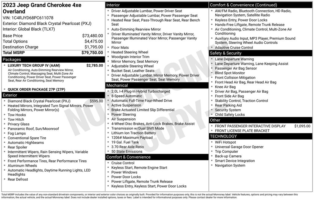 The 2023 Jeep Grand Cherokee Overland 4xe is more than just a vehicle â" it's a statement of your discerning taste and your commitment to the ultimate driving experience. With its stunning Diamond Black Crystal Pearlcoat exterior and 20-inch machined face aluminum wheels, this SUV commands attention wherever it goes, turning heads and leaving a lasting impression.