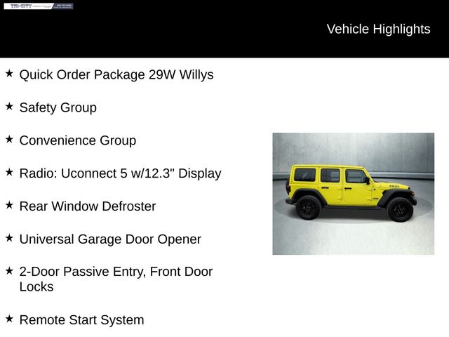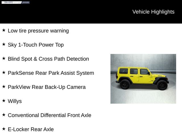 Designed for the adventurous soul, the Wrangler Willys 4xe offers unparalleled off-road capabilities. With features like the E-Locker Rear Axle, Off-Road Plus Mode, and Molded in Color Rubicon Highline Flare, this Jeep is ready to tackle any terrain with confidence.