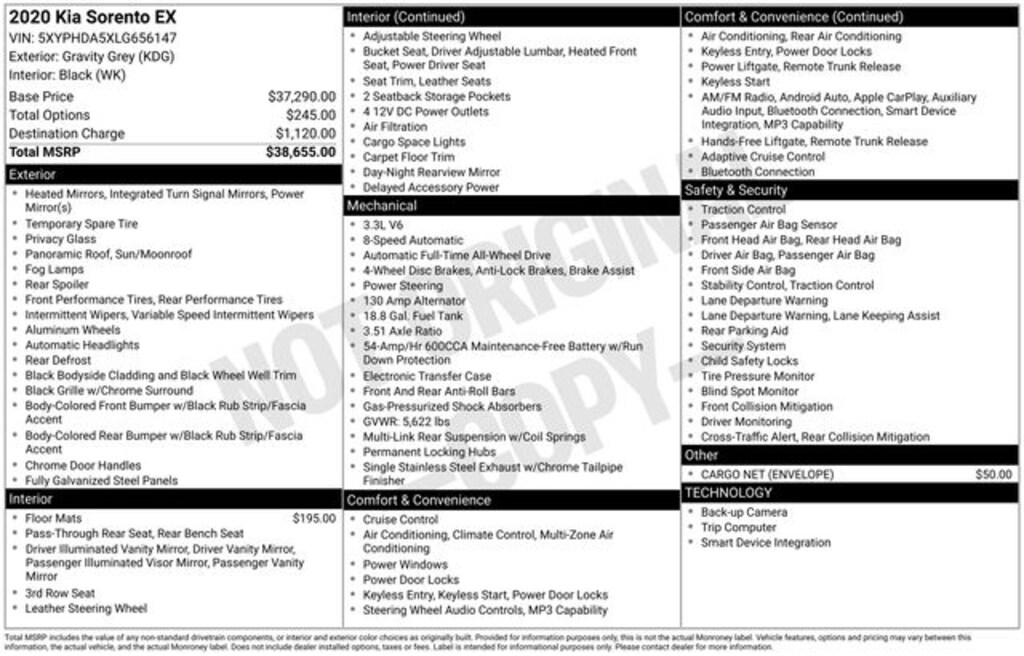 Discover the perfect blend of style, performance, and versatility in this 2020 Kia Sorento EX. This stunning SUV boasts a sleek gray exterior and a powerful V6 engine paired with an 8-speed automatic transmission and all-wheel drive, delivering an exceptional driving experience.