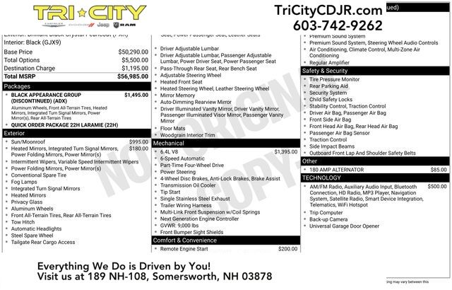 This Ram 2500 Laramie is more than just a workhorse â" it's a true statement of capability and refinement. The 6.4L HEMI V8 engine delivers the power you need to tackle any job, while the Black Appearance Group adds a touch of bold style to the exterior. Inside, the leather-trimmed bucket seats and Uconnect infotainment system create a premium driving experience.