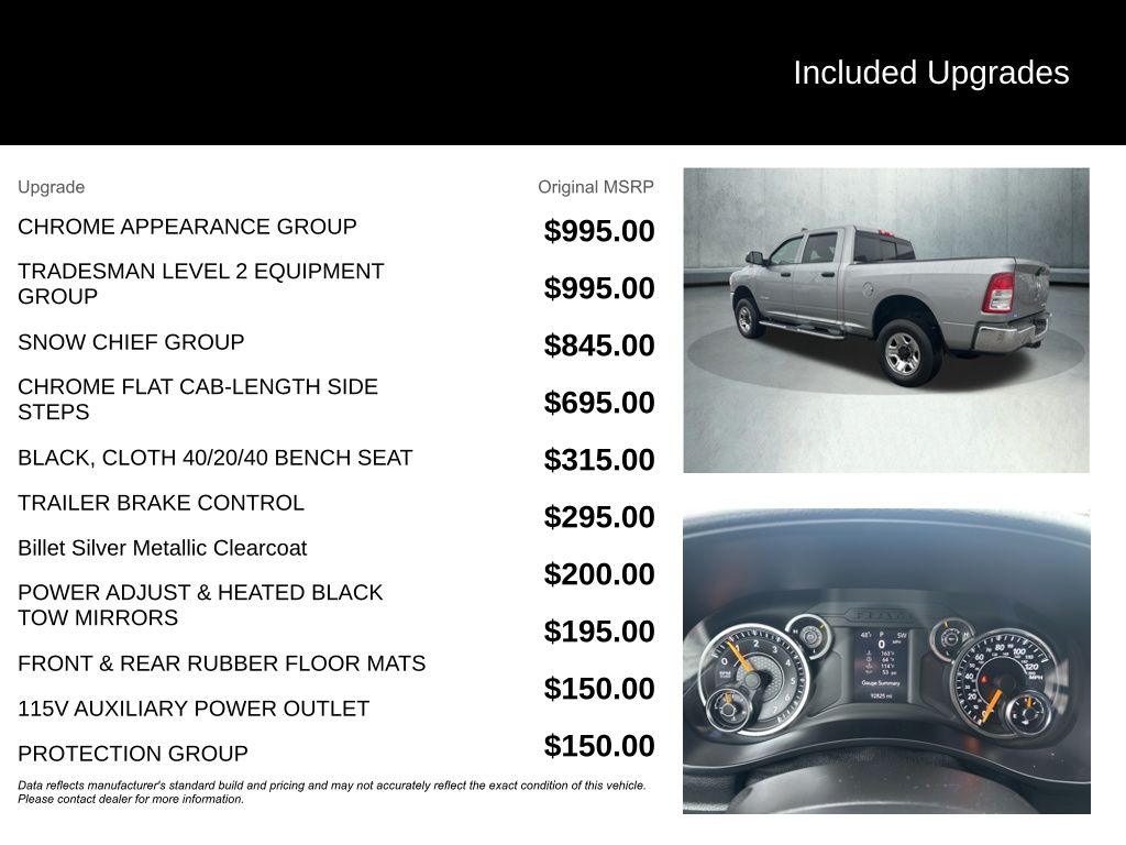 2019 Ram 2500 Tradesman 115V Auxiliary Power Outlet, 220 Amp Alternator, 3.73 Axle Ratio, 400W Inverter, Air Conditioning, Anti-Spin Differential Rear Axle, Brake assist, Chrome Appearance Group, Cloth 40/20/40 Bench Seat, Delay-off headlights, Electronic Stability Control, Exterior Mirrors w/Heating Element, Fully automatic headlights, Illuminated entry, Mirror Running Lights, ParkView Rear Back-Up Camera, Power Adjust & Heated Black Tow Mirrors, Quick Order Package 2ZA Tradesman, Rear Folding Seat, Rear Power Sliding Window, Rear Window Defroster, Remote Keyless Entry, SiriusXM Satellite Radio, Snow Chief Group, Tradesman Level 2 Equipment Group, Trailer Brake Control, Trailer Tow Mirrors, Wheels: 18" x 8.0" Steel Chrome Clad. Clean CARFAX.