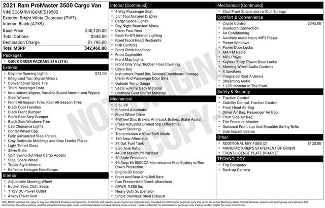 Whether you're running a business, tackling a DIY project, or embarking on a new adventure, the 2021 Ram ProMaster 3500 High Roof is the versatile and capable companion you need. Experience the power, practicality, and refined features that make this van a standout in its class. Visit our showroom today and let us demonstrate how this ProMaster can transform the way you work and play.