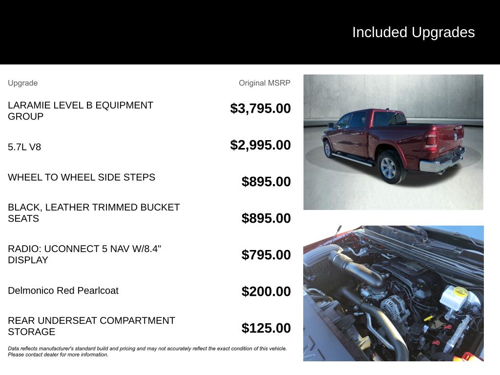 2022 Ram 1500 Laramie 10 Speakers, 2nd Row In Floor Storage Bins, 3.21 Rear Axle Ratio, 4G LTE Wi-Fi Hot Spot, 8.4" Touchscreen Display, Adjustable pedals, Apple CarPlay/Android Auto, Auto High Beam Headlamp Control, Auto-dimming door mirrors, Auto-Dimming Exterior Driver Mirror, Auto-dimming Rear-View mirror, Automatic temperature control, Driver Seat Memory, Exterior Mirrors w/Heating Element, Exterior Mirrors w/Memory, Exterior Mirrors w/Supplemental Signals, Front dual zone A/C, Front fog lights, Fully automatic headlights, GPS Navigation, harman/kardon 19 Speaker Premium Sound, Heated door mirrors, Heated front seats, Heated Second Row Seats, Heated steering wheel, Heavy-Duty Engine Cooling, Laramie Level B Equipment Group (DISC), Outside temperature display, ParkSense Front/Rear Park Assist w/Stop, ParkView Rear Back-Up Camera, Pedal memory, Power 8-Way Driver & Passenger Seats, Power-Folding Mirrors, Quick Order Package 25H Laramie, Radio: Uconnect 5 Nav w/8.4" Display, Rain Sensitive Windshield Wipers, Rear window defroster, SiriusXM Radio Service, Ventilated Front Seats, Wheels: 18" x 8" Aluminum Base Painted. CARFAX One-Owner. Clean CARFAX.