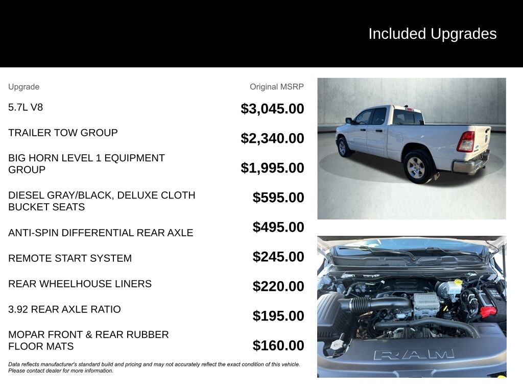 2023 Ram 1500 Big Horn/Lone Star 3.92 Rear Axle Ratio, 4G LTE Wi-Fi Hot Spot, 8.4" Touchscreen Display, Anti-Spin Differential Rear Axle, Apple CarPlay, Auto-Dimming Exterior Driver Mirror, Auto-Dimming Rear-View Mirror, Big Horn Level 1 Equipment Group, Black Trailer Tow Power Mirrors, Bluetooth Handsfree Phone & Audio, Brake assist, Class IV Receiver Hitch, Delay-off headlights, Electric Shift-On-Demand Transfer Case, Electronic Stability Control, Exterior Mirrors w/Heating Element, Front Fog Lamps, Fully automatic headlights, Google Android Auto, Heated door mirrors, Heated Front Seats, Heated Steering Wheel, ParkView Rear Back-Up Camera, Power-Folding Mirrors, Quick Order Package 27Z Big Horn, Radio: Uconnect 5 W w/8.4" Display, Rear Power Sliding Window, Rear Window Defroster, SiriusXM Satellite Radio, Trailer Brake Control, Trailer Light Check, Trailer Reverse Steering Control, Trailer Tire Pressure Monitoring System, Trailer Tow Group, Trailer Tow Mirrors, Wheels: 18" x 8" Cast-Aluminum Painted. CARFAX One-Owner. Clean CARFAX.