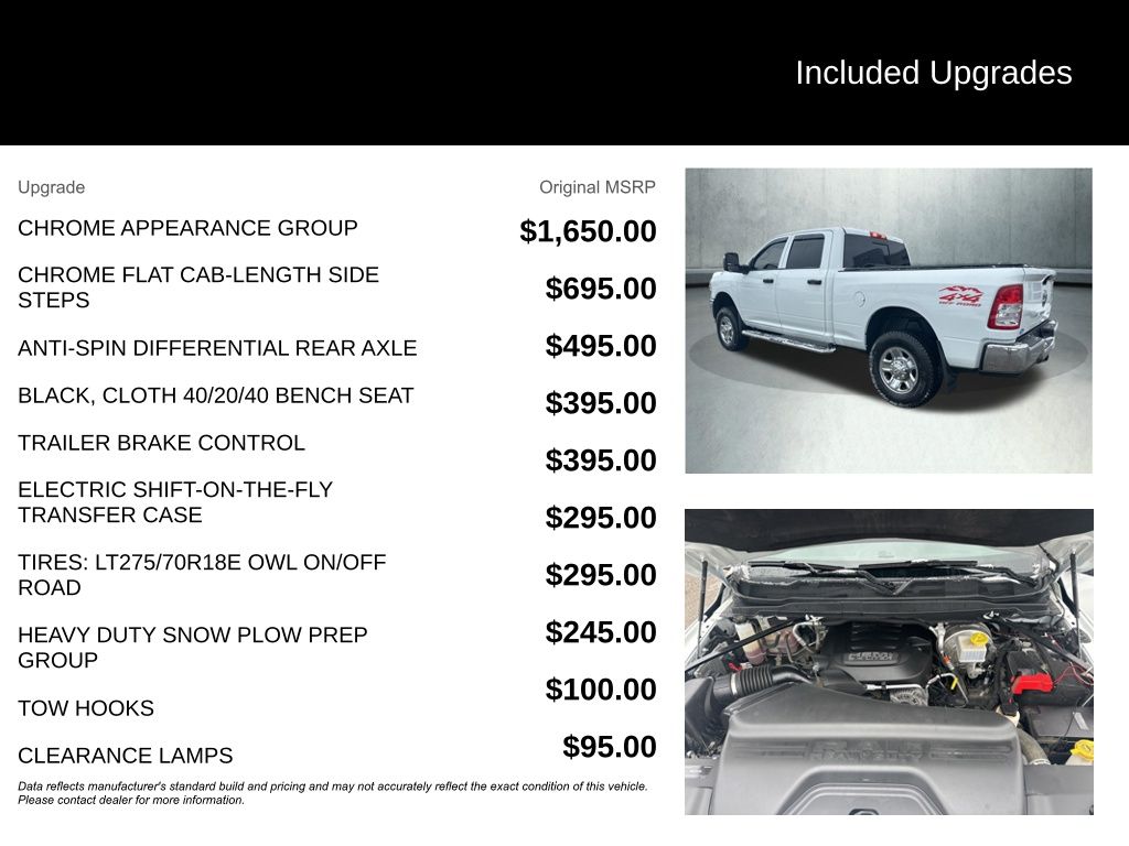 Powered by a robust 6.4L V8 engine and equipped with a capable 4WD system, this Ram 2500 Tradesman is ready to take on any challenge. The available Chrome Appearance Group adds a touch of style with its bright chrome accents, while the Heavy Duty Snow Plow Prep Group ensures you're ready for the toughest winter conditions.