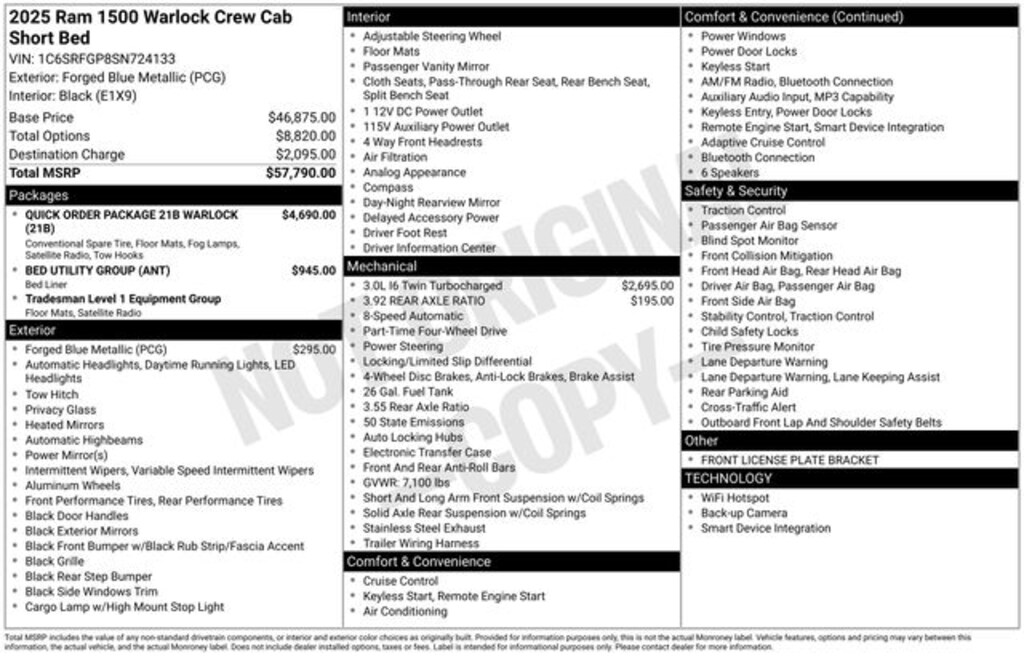 The 2025 Ram 1500 Warlock is more than just a truck â" it's a statement of purpose. With its bold, aggressive styling and impressive off-road capabilities, this vehicle is built to conquer any terrain. The 3.0L I6 Twin Turbocharged Hurricane SO engine delivers exceptional power and efficiency, while the 8-speed automatic transmission with 4WD ensures seamless handling in any conditions.