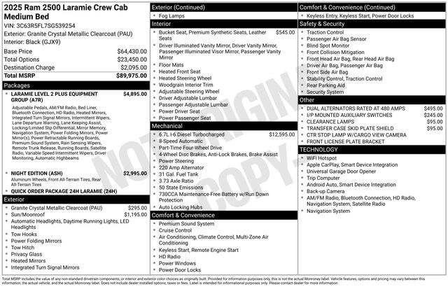 Whether you're hauling heavy equipment, towing a trailer, or simply seeking a capable and comfortable daily driver, this 2025 Ram 2500 Laramie is the perfect choice. Experience the unparalleled power, technology, and refinement that make this truck a true standout in its class. Visit our showroom today and let us demonstrate why this exceptional Ram 2500 should be your next vehicle.