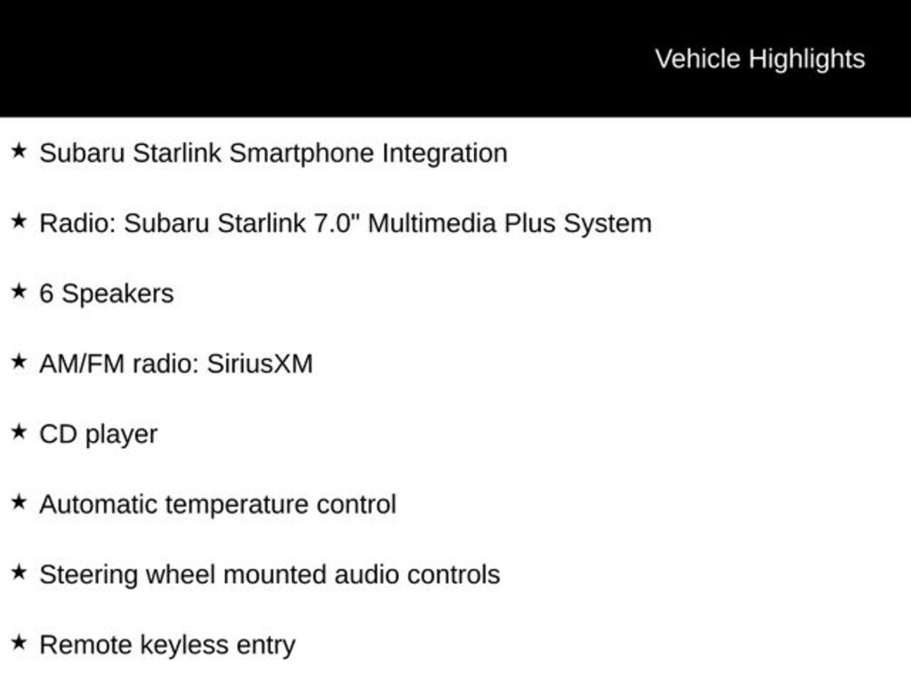 - Radio: Subaru Starlink 7.0" Multimedia Plus System