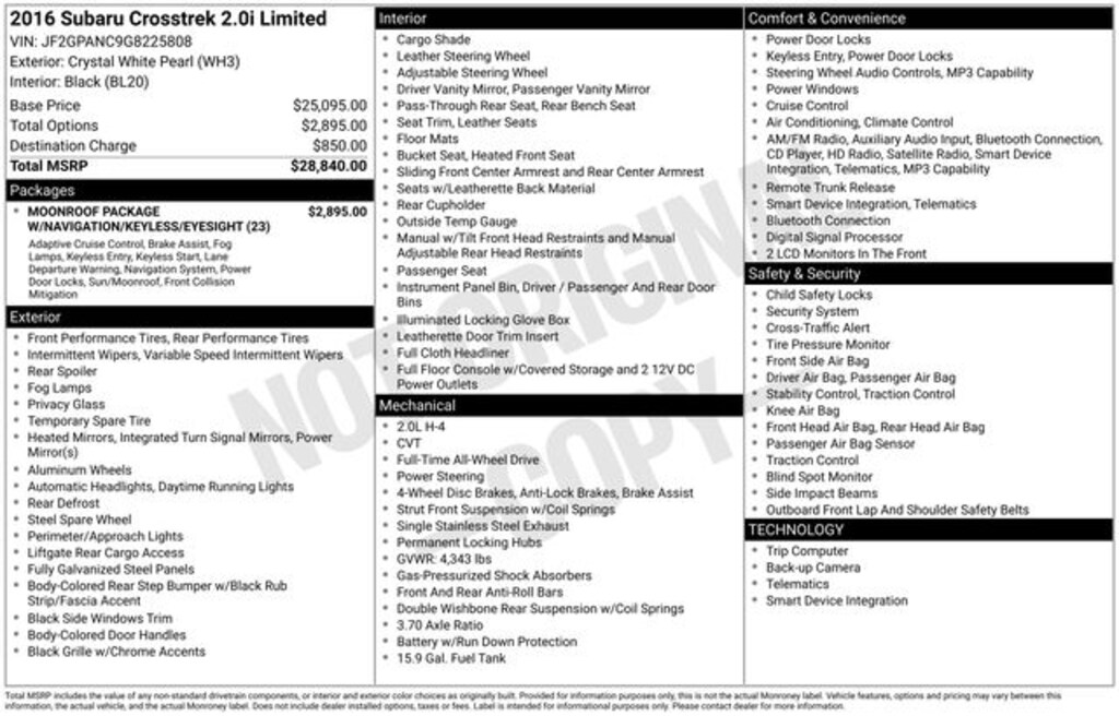 2016 Subaru Crosstrek 2.0i Limited Crystal White Pearl 17" x 7.0J Aluminum Alloy Wheels, 6 Speakers, AM/FM radio: SiriusXM, Automatic temperature control, CD player, Emergency communication system: STARLINK, Exterior Parking Camera Rear, Front fog lights, Heated door mirrors, Leather-Trimmed Upholstery, Power door mirrors, Radio: Subaru Starlink 7.0" Multimedia Plus System, Rear Vision Camera, Remote keyless entry, Speed control, Split folding rear seat, Steering wheel mounted audio controls, Subaru Starlink Smartphone Integration, Telescoping steering wheel, Tilt steering wheel, Turn signal indicator mirrors. CARFAX One-Owner. Clean CARFAX. Odometer is 24273 miles below market average!