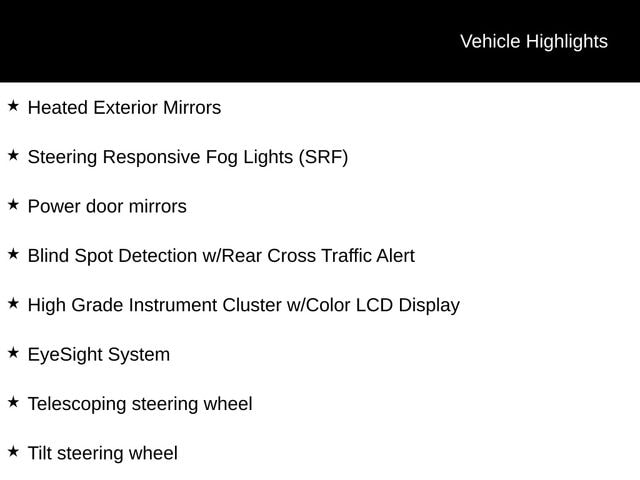 - EyeSight System with Adaptive Cruise Control, Low Speed Pre-Collision Braking, and Vehicle Lane Departure Warning