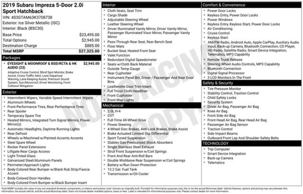 2019 Subaru Impreza 2.0i Sport Ice Silver Metallic 18" Alloy Wheels, 6 Speakers, Blind Spot Detection (BSD), Emergency communication system, Exterior Parking Camera Rear, EyeSight & Moonroof & BSD/RCTA & HK Audio, EyeSight System, Fully automatic headlights, harman/kardon Amplifier & Speakers, Heated door mirrors, Heated Front Bucket Seats, Power door mirrors, Power Moonroof, Radio: Subaru STARLINK 8.0" Multimedia Plus System, Rear Cross Traffic Alert (RCTA), Remote keyless entry, Speed control, Split folding rear seat, Sport Fabric Upholstery, STARLINK/Apple CarPlay/Android Auto, Steering wheel mounted audio controls, Telescoping steering wheel, Tilt steering wheel, Turn signal indicator mirrors. CARFAX One-Owner. Clean CARFAX. Odometer is 68060 miles below market average!