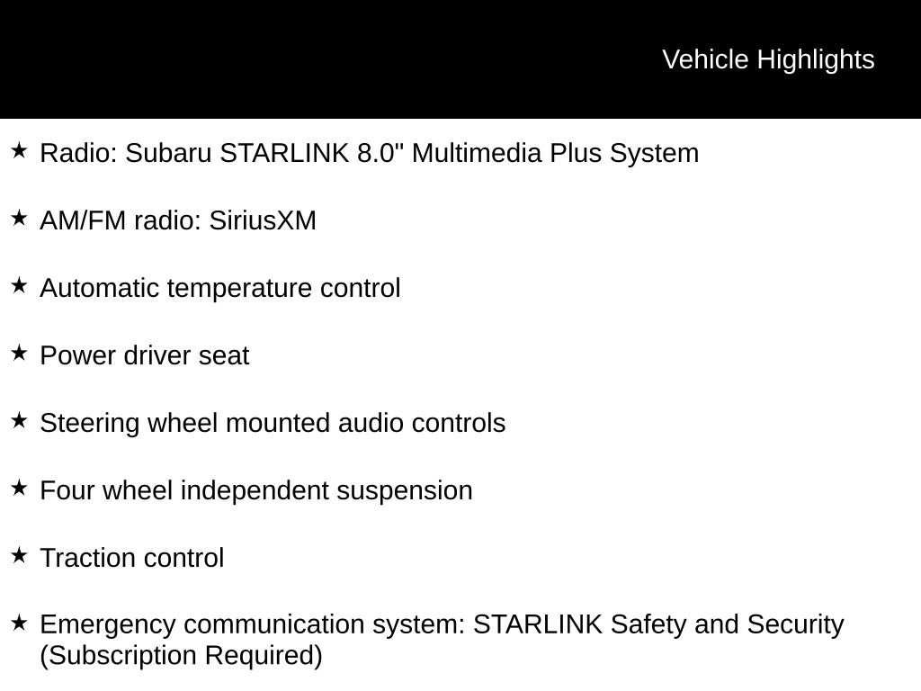 - Radio: Subaru STARLINK 8.0" Multimedia Plus System
