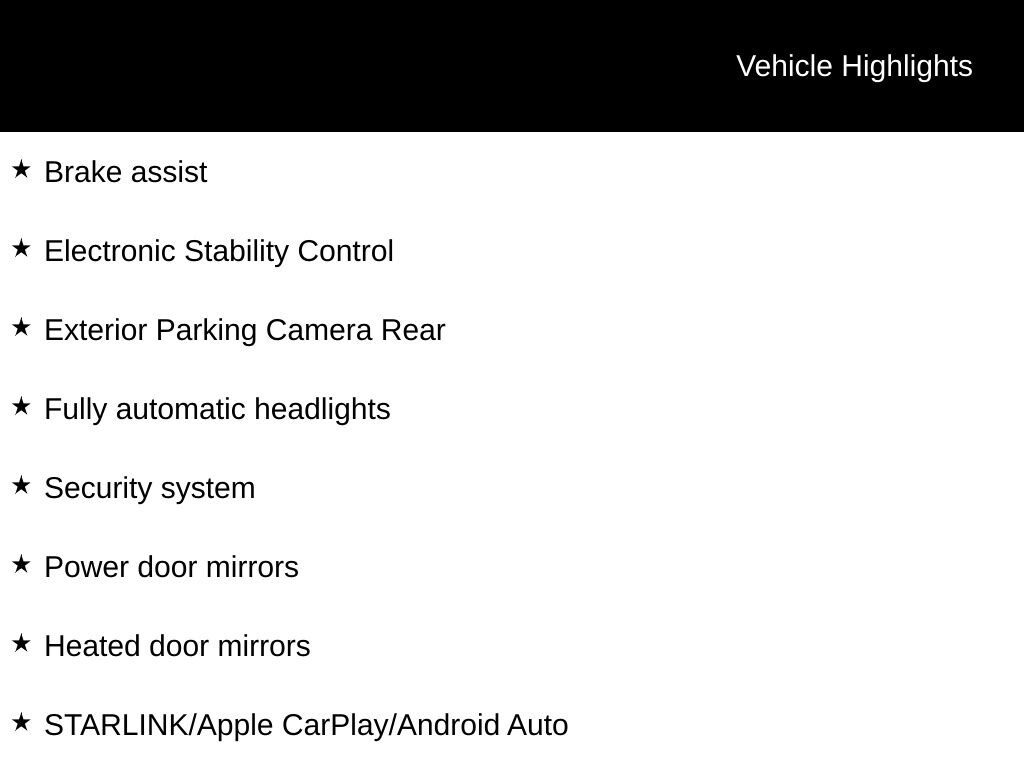 Safety is also a top priority, with features like the Rear Camera, Brake Assist, and Electronic Stability Control working tirelessly to help protect you and your passengers. The Emergency Communication System, with its STARLINK Safety and Security subscription, provides an added layer of security and peace of mind.