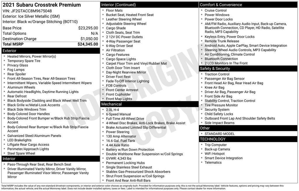 This SUV is purpose-built for the most treacherous terrain! Subaru infused the interior with top shelf amenities, such as: power door mirrors and heated door mirrors, an overhead console, and a split folding rear seat. Under the hood you'll find a 4 cylinder engine with more than 150 horsepower, and for added security, dynamic Stability Control supplements the drivetrain.