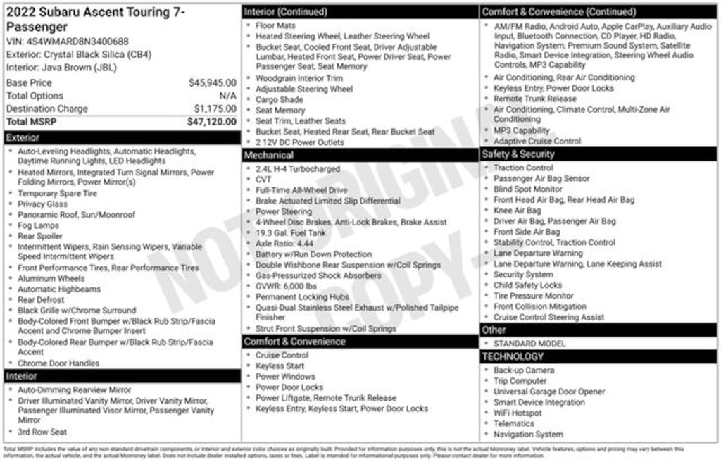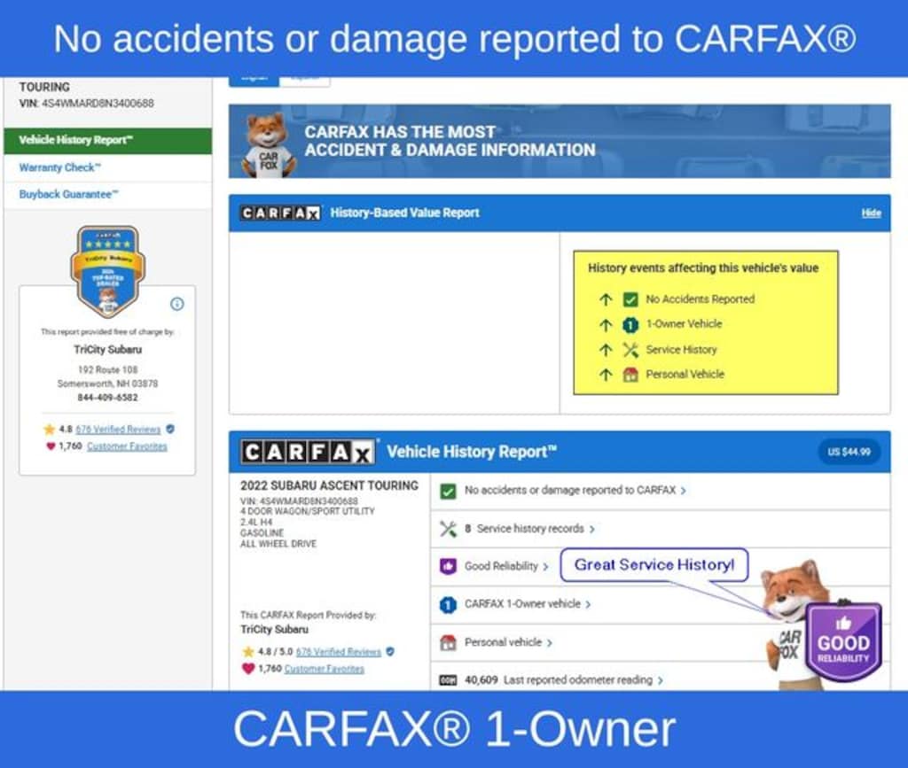 2022 Subaru Ascent Touring Crystal Black Silica 14 Speakers, 3rd row seats: bench, Auto-dimming Rear-View mirror, CD player, Emergency communication system: STARLINK Safety and Security (Subscription Required), Exterior Parking Camera Rear, Front dual zone A/C, Front fog lights, Fully automatic headlights, Garage door transmitter: HomeLink, harman/kardon® Speakers, Heated & Ventilated Front Bucket Seats, Heated door mirrors, Heated rear seats, Heated steering wheel, Memory seat, Navigation System, Perforated Leather-Trimmed Upholstery, Power door mirrors, Power driver seat, Power Liftgate, Power moonroof, Power passenger seat, Radio: Subaru STARLINK 8.0" Multimedia Nav System, Reclining 3rd row seat, Remote keyless entry, Speed control, Split folding rear seat, STARLINK/Apple CarPlay/Android Auto, Steering wheel mounted audio controls, Telescoping steering wheel, Tilt steering wheel, Turn signal indicator mirrors, Wheels: 20" x 7.5 J Dk Gray Alloy w/Machine Finish. CARFAX One-Owner. Clean CARFAX. Odometer is 9465 miles below market average!