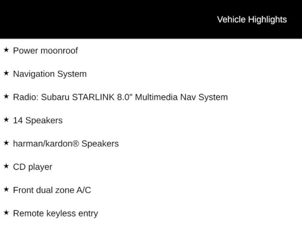 - Radio: Subaru STARLINK 8.0" Multimedia Nav System