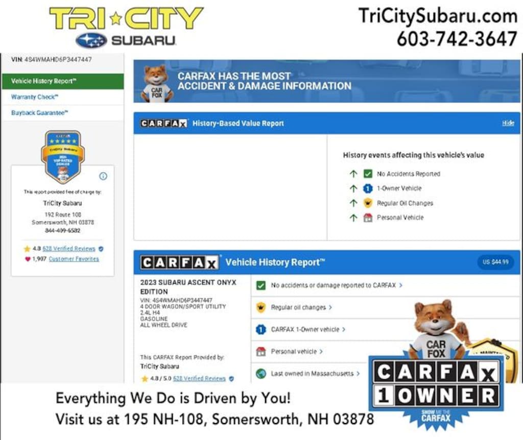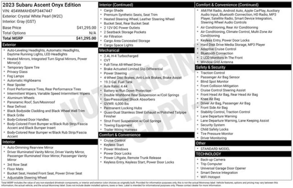 Experience the ultimate in family-friendly SUV performance with the 2023 Subaru Ascent Onyx Edition. Visit our showroom today and let our team of experts guide you through this exceptional vehicle. We're confident that once you take it for a test drive, you'll be ready to make it part of your family's adventure.