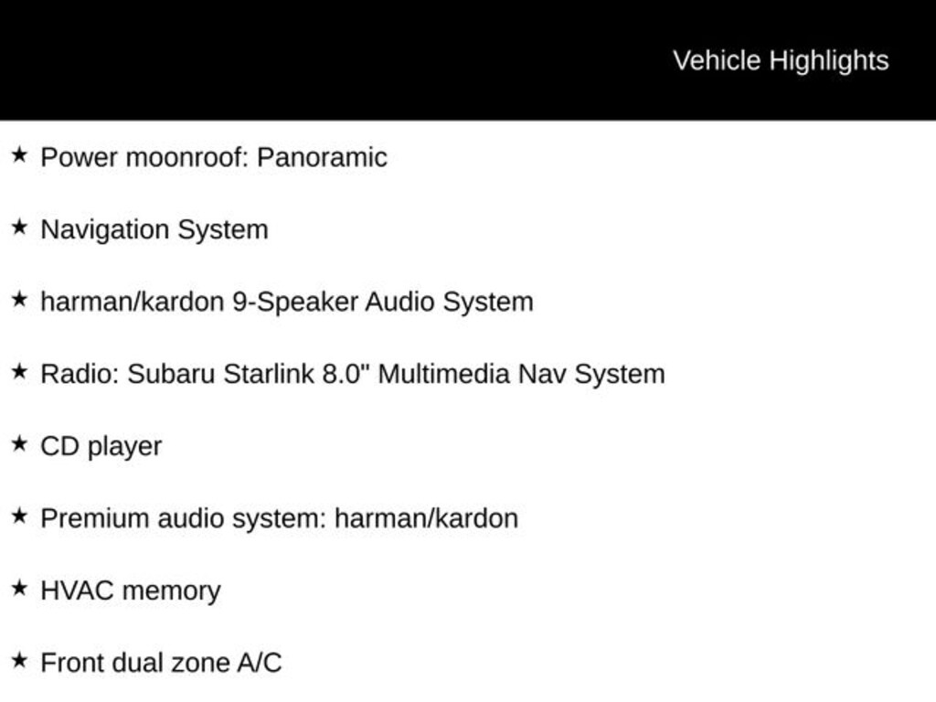 - Radio: Subaru Starlink 8.0" Multimedia Nav System