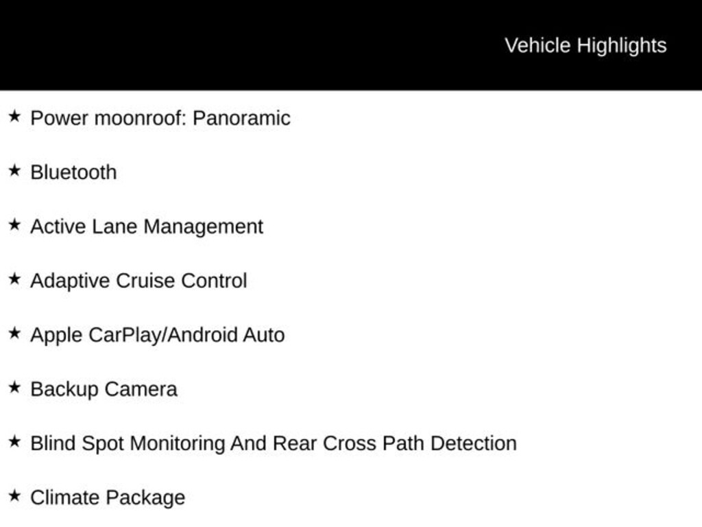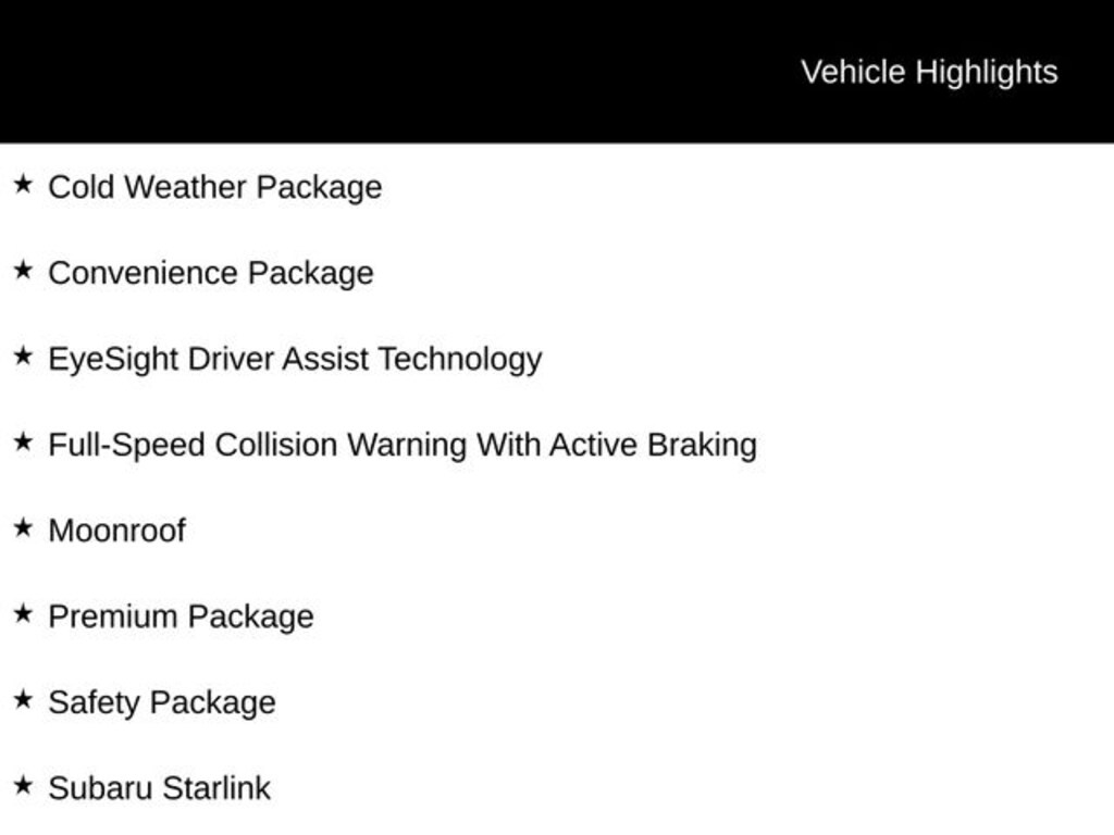 ⢠Bluetooth, Active Lane Management, Adaptive Cruise Control, Apple CarPlay/Android Auto, Backup Camera, Blind Spot Monitoring And Rear Cross Path Detection, Climate Package, Cold Weather Package, Convenience Package, EyeSight Driver Assist Technology, Full-Speed Collision Warning With Active Braking, Moonroof, Premium Package, Safety Package, Subaru Starlink, Sunroof/Moonroof, Winter Package, and Heated Seats.