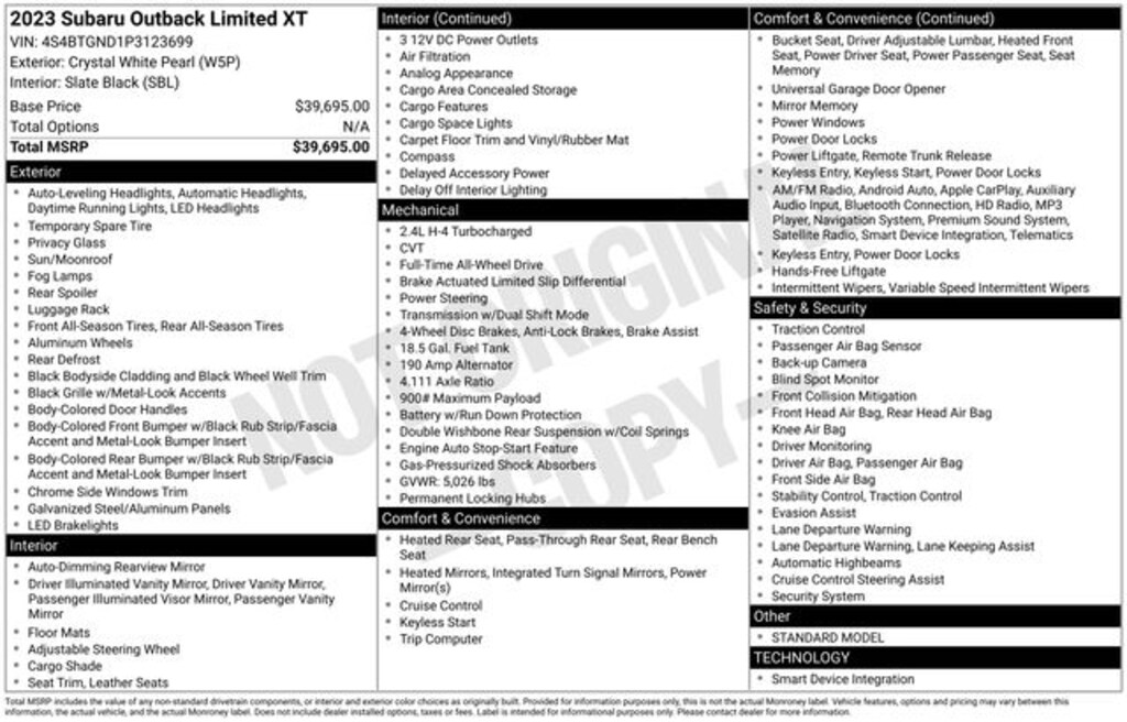 Boasting a captivating array of features, the Outback Limited XT is the embodiment of refined elegance and uncompromising performance. From the striking 18-inch Black Aluminum Alloy wheels to the sophisticated Perforated Leather-Trimmed Upholstery, every detail has been meticulously crafted to elevate your driving experience.