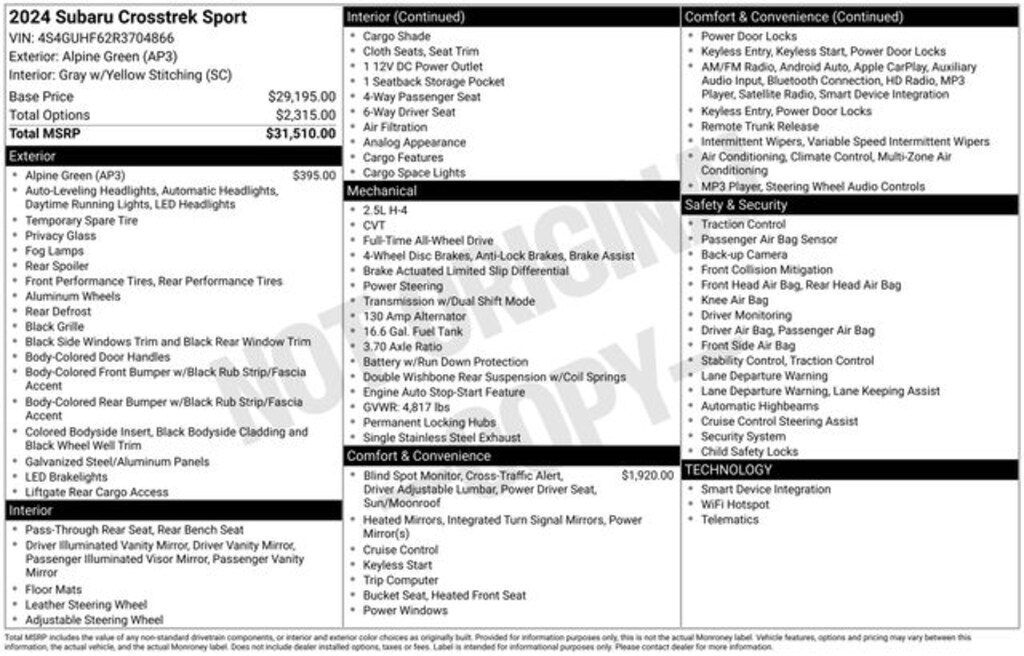 At our dealership, we're committed to providing you with an exceptional buying experience. Our knowledgeable sales team is here to answer any questions you may have and help you find the perfect vehicle to suit your needs. Come in and test drive the 2024 Subaru Crosstrek Sport today â" we're confident you'll be impressed by its performance, features, and value.