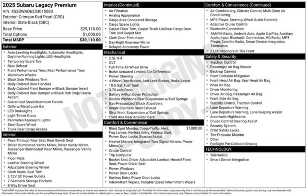 But don't just take our word for it. Come experience the 2025 Subaru Legacy Premium for yourself and discover the true meaning of automotive excellence. We're confident that once you get behind the wheel, you'll never want to settle for anything less.