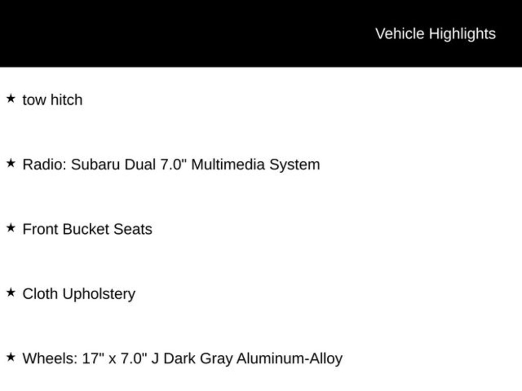 - Radio: Subaru Dual 7.0" Multimedia System