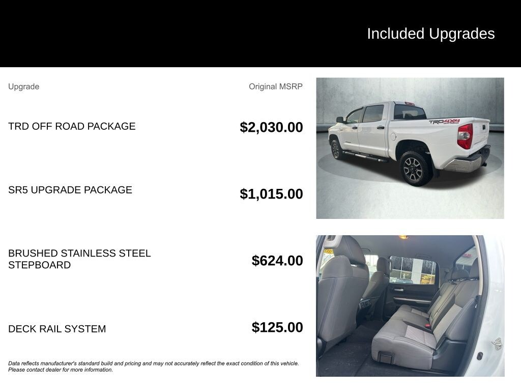 ⢠TRD Off Road Package: Includes off-road tires, TRD alloy wheels, Bilstein shock absorbers, and skid plates for enhanced capability.