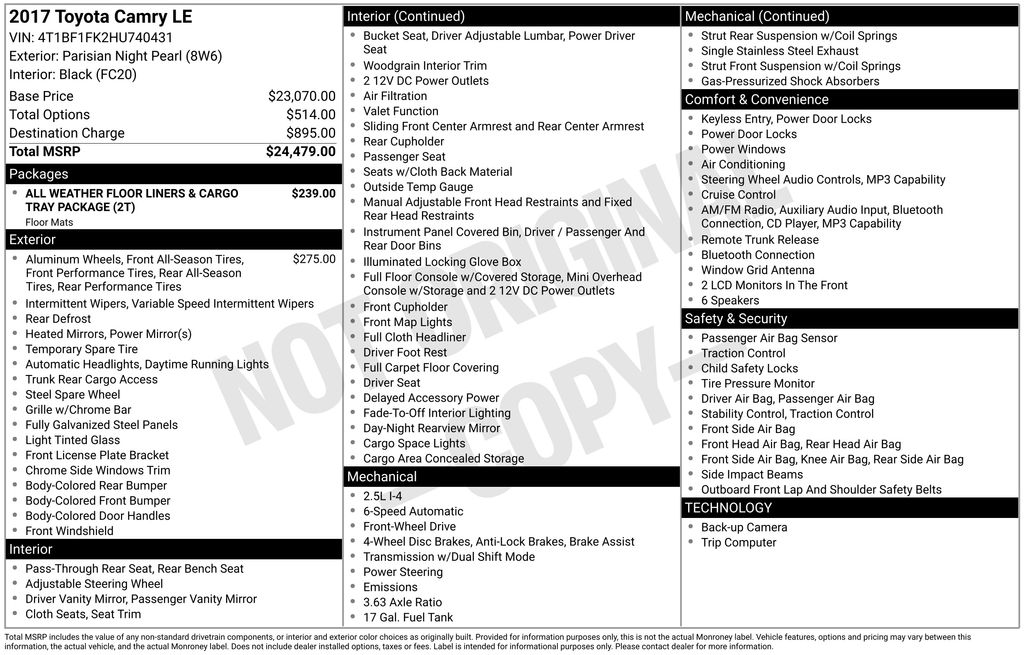 Slip behind the wheel of this well-equipped Camry XLE and experience the remarkable blend of style, comfort, and technology that sets it apart. The 2.5L I4 SMPI DOHC engine, paired with a 6-Speed Automatic transmission, delivers a responsive and efficient performance, earning an impressive 24 city/33 highway MPG.