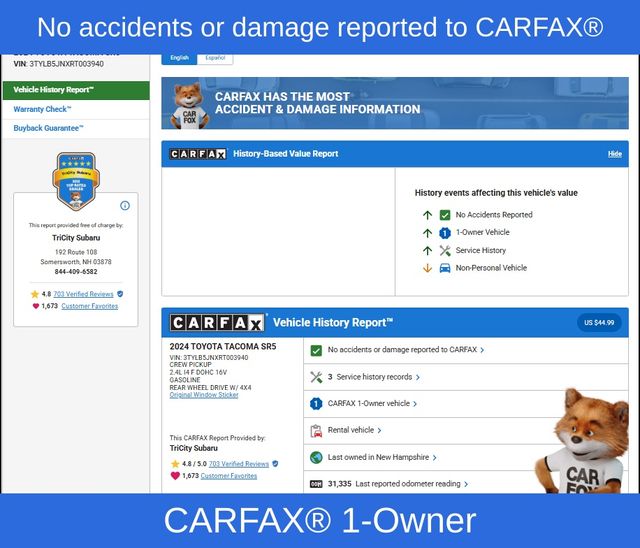 Under the hood, the Tacoma SR5 packs a powerful punch with its 2.4L 4-cylinder engine and 8-speed automatic transmission. With 4-wheel drive, you'll conquer any terrain with confidence, whether you're trekking through mud, snow, or sand. And with an impressive fuel economy of 19 city and 24 highway MPG, you can go the distance without constantly stopping at the pump.