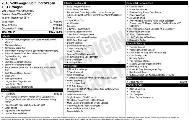 Discover the versatile and well-equipped 2016 Volkswagen Golf SportWagen S, a smart choice for those seeking a spacious, efficient, and tech-savvy compact wagon. This Golf SportWagen combines Volkswagen's renowned German engineering with a practical, yet stylish design, making it the ideal companion for your daily commute or weekend adventures.